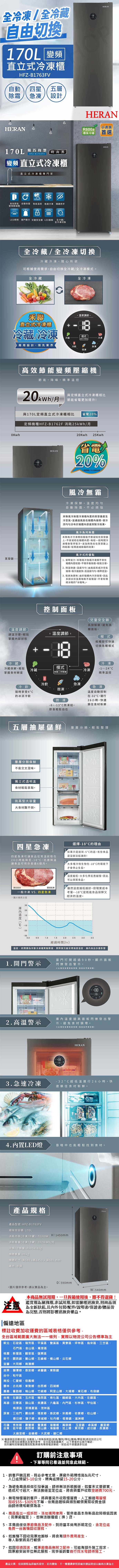 【禾聯HERAN】170L變頻直立式冷凍櫃 HFZ-B1763FV