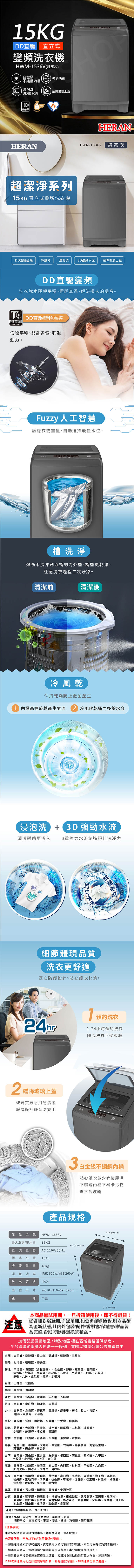 【禾聯HERAN】15KG直立式變頻洗衣機 HWM-1536V