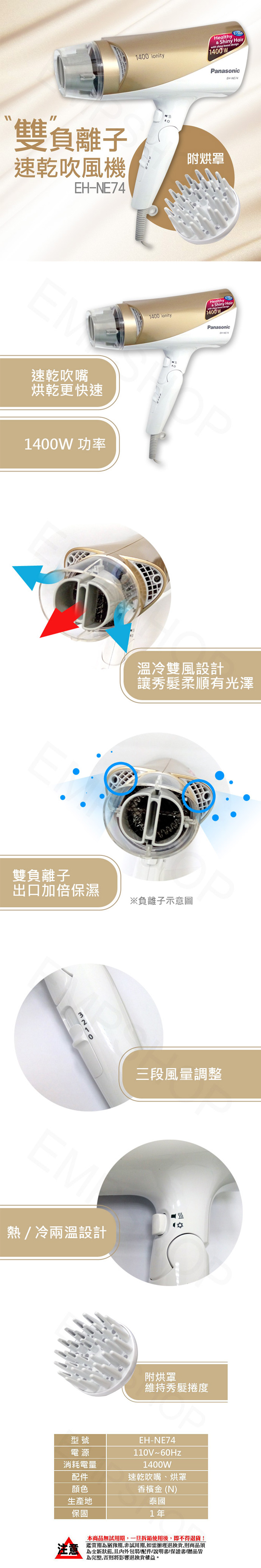 【國際牌Panasonic】附烘罩雙負離子速乾吹風機 EH-NE74