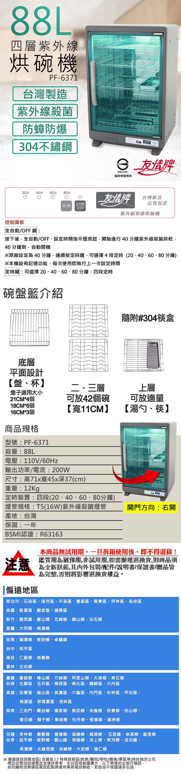 【友情牌】88公升四層紫外線烘碗機 PF-6371